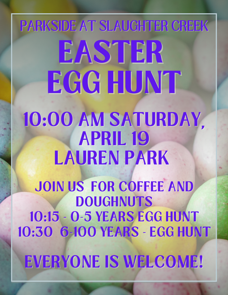 Please join us on Saturday April 19th at Lauren Park for our Easter Egg Hunt!
